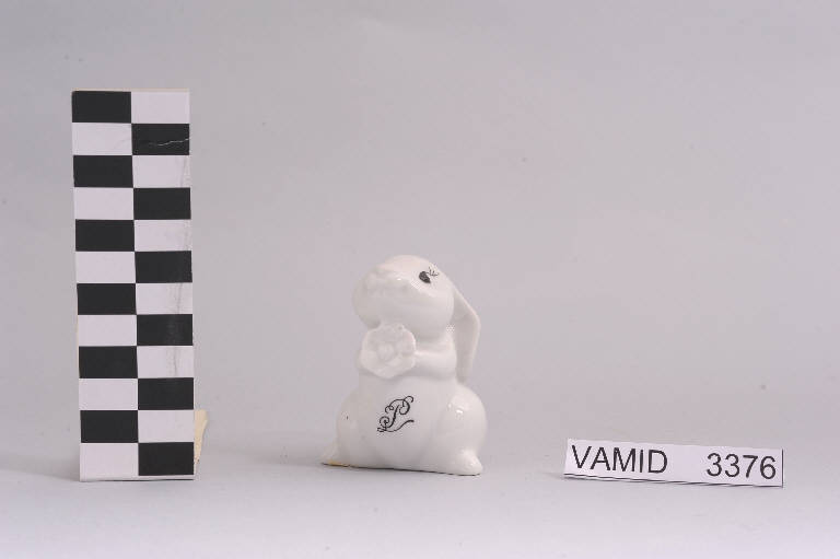 Pepiera a forma di coniglio con busto rialzato, orecchie basse e fiore tra le zampe; piccoli fori sulla testa per permettere la fuoriuscita del pepe; fondo bianco con lettera "P" in nero sulla pancia.