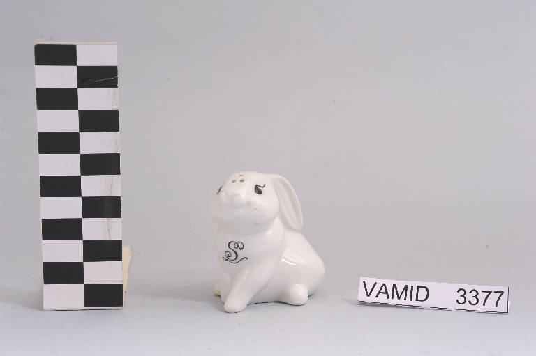 Saliera a forma di coniglio in posizione accovacciata con orecchie basse; tre fori sulla testa per permettere la fuoriuscita del sale; fondo bianco con lettera "S" in nero sulla pancia.