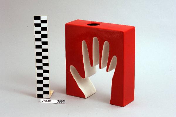 Vaso a forma di parallelepipedo con impronta di mano smaltato esternamente in rosso ed internamente in bianco; piccolo foro circolare nella faccia superiore per permettere l'inserimento dei fiori.