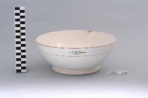 Insalatiera con corpo liscio semisferico poggiante su un piede estroflesso; fondo bianco ornato da una semplice decorazione costituita da piccoli fiori e filettature rosse.