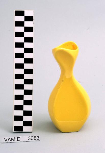 Vasetto panciuto nella parte inferiore con collo stretto e imboccatura "a boccaglio"; fondo di colore giallo uniforme.