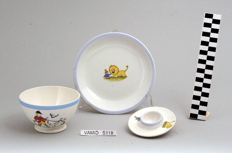 Il servizio da tavola da bambino è composto da una tazza da colazione, un piatto fondo e un portauovo di colore bianco con una fascia celeste lungo il bordo e, sul fondo del piatto, sul corpo della tazza e sul piattino del portauovo, vignette policrome con scenette stilizzate di animali e bambini.