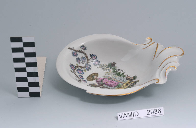 - NOTIZIE STORICO CRITICHE La ciotola (un probabile portadolci) si accompagna ad un'altro manufatto analogo, anch'esso di gusto cinese (n. inv. 2937). Le decorazioni dei due contenitori, eseguite a decalcomania, richiamano le cineserie francesi della prima metà del Settecento: allo stile rococò si rifà esplicitamente anche la forma del recipiente, evocativa di una valva di conchiglia.\n Lo stabilimento Verbano di Laveno, costruito nel 1924 per la fabbricazione di isolatori in porcellana sulla base di un'intesa con la Porzellanfabrik Rosenthal di Selb (Baviera), iniziò la produzione di porcellana da tavola nel 1931: tale produzione cessò nel 1966.\nIl decoro risulta presente nei cataloghi dello stabilimento Verbano della Società Ceramica Italiana con numero 1511 (Busta 85, fascicolo 2).