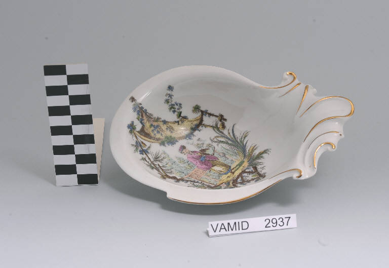- NOTIZIE STORICO CRITICHE La ciotola (un probabile portadolci) si accompagna ad un'altro manufatto analogo, anch'esso di gusto cinese (n. inv. 2936). Le decorazioni dei due contenitori, eseguite a decalcomania, richiamano le cineserie francesi della prima metà del Settecento: allo stile rococò si rifà esplicitamente anche la forma del recipiente, evocativa di una valva di conchiglia. \nLo stabilimento Verbano di Laveno, costruito nel 1924 per la fabbricazione di isolatori in porcellana sulla base di un'intesa con la Porzellanfabrik Rosenthal di Selb (Baviera), iniziò la produzione di porcellana da tavola nel 1931: tale produzione cessò nel 1966.\nIl decoro risulta presente nei cataloghi dello stabilimento Verbano della Società Ceramica Italiana con numero 1511 (Busta 85, fascicolo 2).