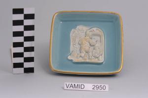 Posacenere quadrato in porcellana smaltata di azzurro con filettatura dorata sull'orlo; fondo a rilievo con due ceramisti al lavoro davanti a una fornace e in lontananza una veduta del lago con una barca a vela e uno stabilimento.