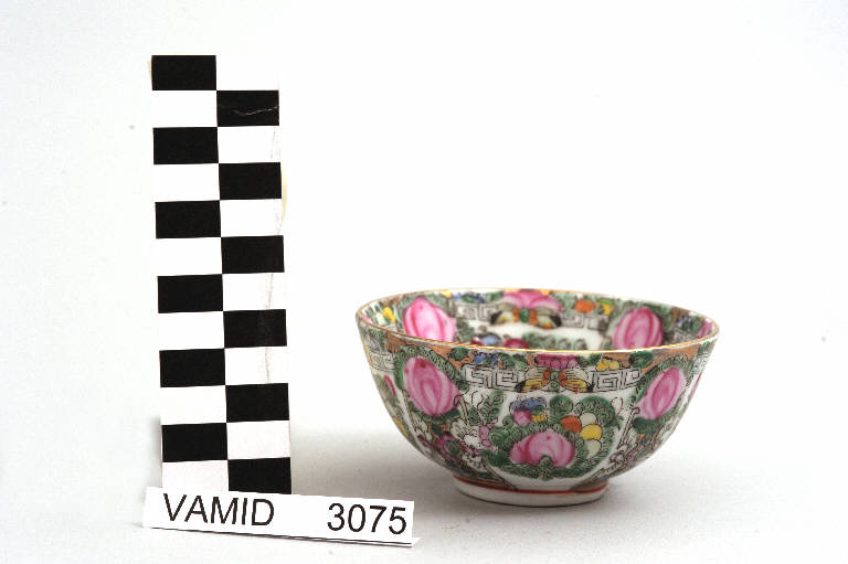 - NOTIZIE STORICO CRITICHE La ciotola in porcellana è decorata a mano sopra vernice con rigogliosi ornati vegetali ed elementi geometrici. Come attesta l'iscrizione presente nel marchio il manufatto è stato realizzato con una decorazione caratteristica della città di Canton in Cina. L'etichette recante la scritta "UNDER STRICT SUPERVISION/ BY / H. F. P.MACAU/ MADE IN CHINA" si riferisce con ogni probabilità all'importatore dell'oggetto in Europa.