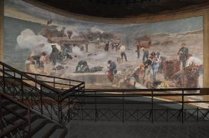 - NOTIZIE STORICO CRITICHE Proseguendo al secondo livello si incontra la sala affrescata da Vittorio Emanuele Bressanin e dedicata all'episodio della "Difesa di Venezia" avvenuta nel 1849. "Dovendo scegliere un episodio dell'assedio della città, l'artista ha deciso di ritrarre un momento di quasi totale e sofferta inazione". La scena è ambientata presso il forte di San'Antonio, riconoscibile insieme ai resti del ponte ferroviario; sullo sfondo è rappresentato il trasporto del corpo del volontario dell'esercito napoletano Cesare Rossarol [Regonelli S., Gli affreschi di San Martino della Battaglia. Il Risorgimento dipinto nel ciclo della Gran Torre, Torino, Allemandi & C. 2011, p. 38].