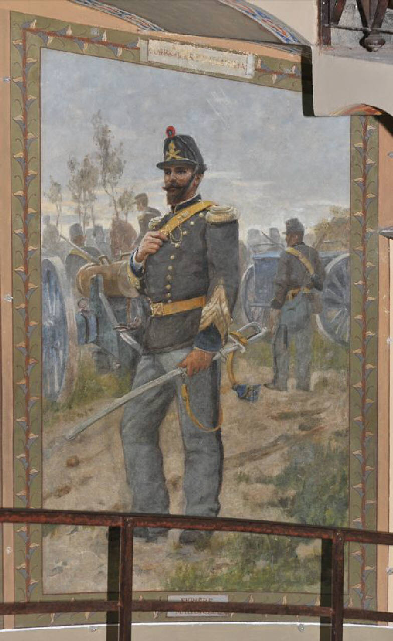 - NOTIZIE STORICO CRITICHE Tra la quarta e la quinta sala, lungo il percorso, lo stesso De Stefani ha realizzato, con la collaborazione del giovane Giuseppe Vizzotto Alberti, una seconda "serie di dieci "Ritratti di uniformi dell'Armata Sarda del 1859" tratti da modelli ad acquerello forniti dall'illustratore imolese Quinto Cenni e tratteggiati con pennellate asciutte, pulite, attente a rendere ogni figura con la necessaria chiarezza descrittiva e cromatica" [Regonelli S., Gli affreschi di San Martino della Battaglia. Il Risorgimento dipinto nel ciclo della Gran Torre, Torino, Allemandi & C. 2011, p. 39].