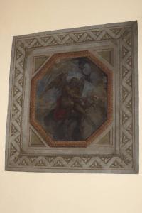 Cornice dipinta con fascio centrale a girali di vegetali entro modanature monocrome.