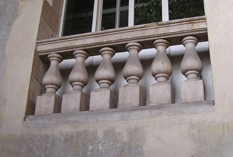 Balaustrata costituita da un ordine di sei pilastri con base a dado e fusto ad anfora, con mensolone modanato aggettante.