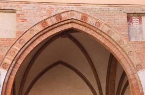 Ghiera d'arco costituita da un paramento in mattoni disposti a raggiera definiti da un cordolo e decorata da rosette a rilievo.