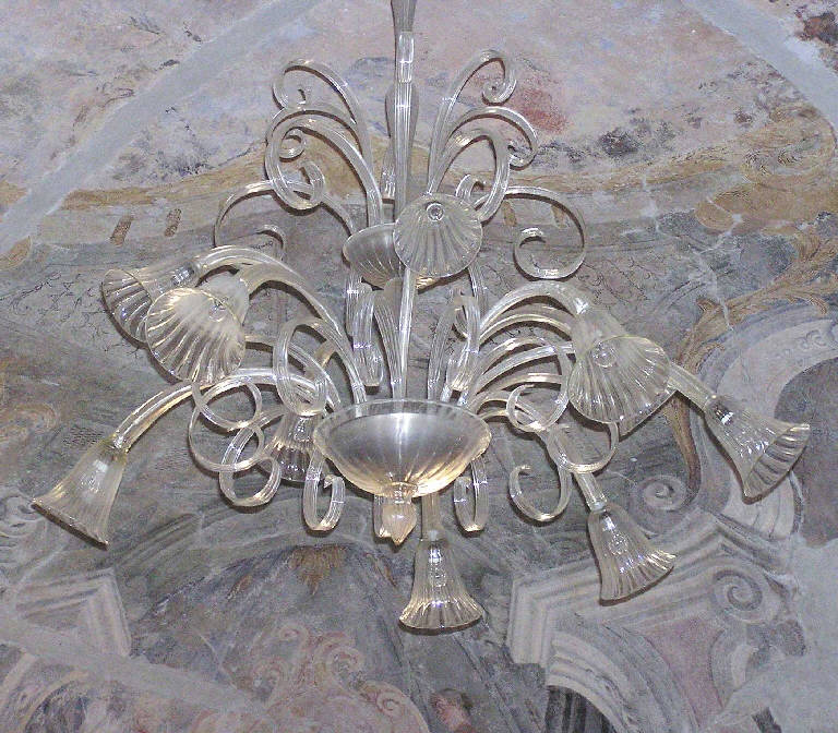 Lampadario con sostegno centrale a balaustri intervallato da coppette dalle quali si dipartano i bracci disposti su due ordini: quello superiore è caratterizzato da elementi a voluta, quello inferiore alterna elementi a voluta a nove bracci che terminano con bobèches a calice sfaccettati.
