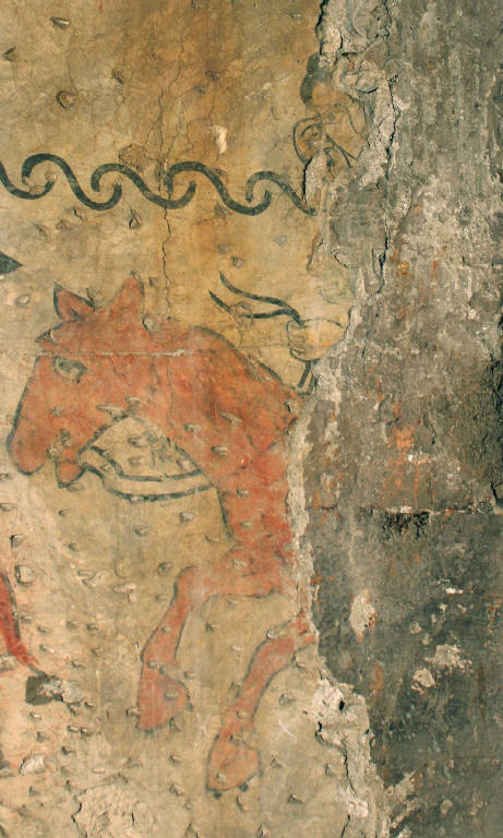 - NOTIZIE STORICO CRITICHE Il primo piano dell'ala meridionale del Broletto, che fu costruita nel secondo quarto del XIII secolo, era occupato da un salone molto grande dove si riuniva il Consiglio di Credenza della Città. Le dimensioni di questo spazio erano imponenti: era lungo quasi 52 metri, largo 14 metri e mezzo ed alto 9 m; era illuminato da grandi finestre polifore, il soffitto era a capriate lignee. Questo vasto ambiente restò in uso fino alla fine del XVI secolo quando fu suddiviso orizzontalmente: nella parte inferiore vennero create delle salette, in quella superiore, posta appena sotto il tetto, fu ricavata una soffitta adibita a vari usi fra cui quello di Archivio Storico Civico. Tra il 1944 e il 1946 i documenti e i materiali dell'Archivio Storico Civico vennero spostati e sulle pareti settentrionale e meridionale del sottotetto fu scoperta una decorazione ad affresco piuttosto vasta che, in epoca medievale, ornava le pareti del Salone del Consiglio della Città di Brescia. Nel 1946 i dipinti sono stati discialbati, ripuliti e consolidati dal restauratore Bertelli che mette in luce due strati sovrapposti di affreschi. Il primo, pertinente alla seconda metà del XIII secolo, raffigura una teoria di cavalieri incatenati che escono dalle porte della città facendo riferimento ai diversi provvedimenti presi dal Comune bresciano per allontanare i nobili di parte ghibellina della città nell'ultimo quarto del XIII secolo. Il secondo strato della decorazione pittorica, invece, è databile a qualche decennio più tardi e comprende la raffigurazione della cosiddetta "Pace di Bagnolo Mella" che, nel 1298, pose fine alle lotte civili fra guelfi e ghibellini stabilendo su Brescia la signoria del Vescovo Berardo Maggi e vari dipinti di soggetto sacro che, nel 1946, vennero strappati dalle pareti per mettere in luce la sfilata dei cavalieri ed oggi sono conservati nella Pinacoteca Civica.