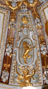 Specchiatura con profilo definito da una cornice decorata ad ovuli e grande cartella a cartocci nella parte centrale. La cartella, che nella parte inferiore e in quella superiore, ha una testa femminile a rilievo, contiene lo stemma comunale di Brescia a rilievo.
