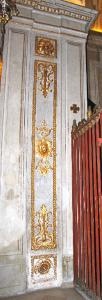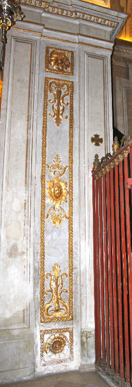 Decoro plastico composto da una specchiatura quadrangolare arricchita da decori vegetali stilizzati e rosette a rilievo; al centro mascherone a rilievo