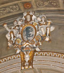 Ricchissima cartella a cartocci con medaglione centrale dipinto con lo stemmma di Brescia, profilo a cartocci sui quali si inseriscono, lungo il lato destro e sinistro, due figure allegoriche a rilievo. La sommità della cartella è invece caratterizzata da un mascherone femminile e il profilo inferiore da festoni di frutta.