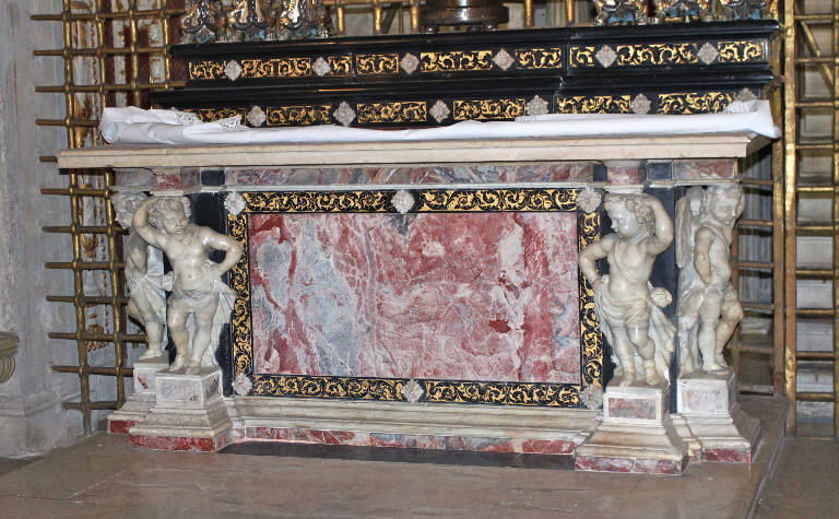 Elegante altare caratterizzato da paliotto in marmo venato con cornice in marmo nero ad intarsi dorati, mensa sostenuta da quattro putti a tutto tondo e gradini in marmo nero con intarsi dorati che ripropongono il motivo decorativo della cornice del paliotto.