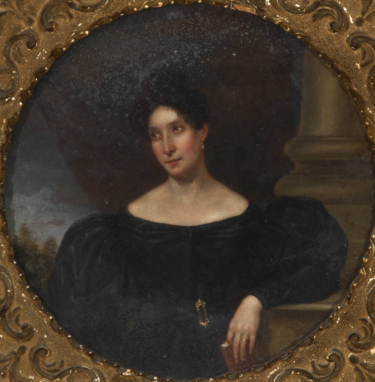 - NOTIZIE STORICO CRITICHE Il dipinto è il pendant dell'inv. n. 38156 "ritratto di uomo a mezzo busto con lettera in mano" con quale condivide dimensioni, caratteristiche materiali e stilistiche. Anche la cornice in legno intagliato e dorato di pregievole fattura è identica. I dati compositivi e stilistici, come quelli dell'abbigliamento e delle acconciature degli effigiati permettono di riferire entrambe le opere al contesto della ritrattistica milanese del terzo decennio del XIX secolo.
