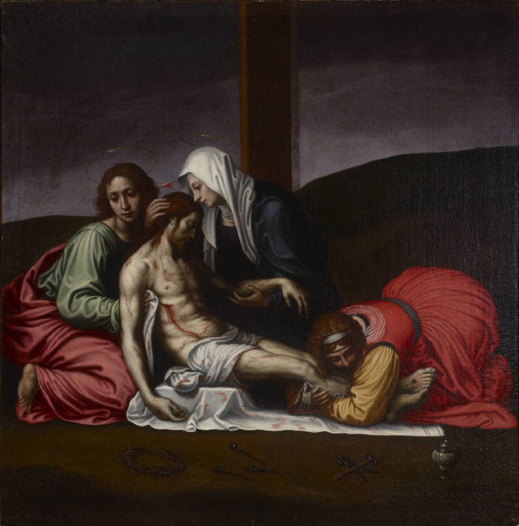 - NOTIZIE STORICO CRITICHE Il dipinto ad oggetto, che rivela un'alta tenuta stilistica, è una copia seicentesca della "Deposizione di Cristo nel sepolcro" realizzata nel 1516 dal pittore fiorentino Frà Bartolomeo, oggi conservata alla Galleria di Palazzo Pitti a Firenze. Tale interpretazione è avvalorata da un'iscrizione, successiva alla realizzazione della tela e apposta sul retro della cornice, dove è indicato proprio il nome di Frà Bartolomeo.\nL'ambito di riferimento per la realizzazione della copia è quello del pittore marchigiano Giovanni Battista Salvi detto il Sassoferato (1609-1685), della cui maniera sono ravvisabili diversi tratti stilistici, come la forte connotazione accademica, e di cui è nota l'attività di copista di dipinti celebri.\nL'esistenza di un sigillo sul retro può indicare la precedente collocazione presso una importante raccolta.