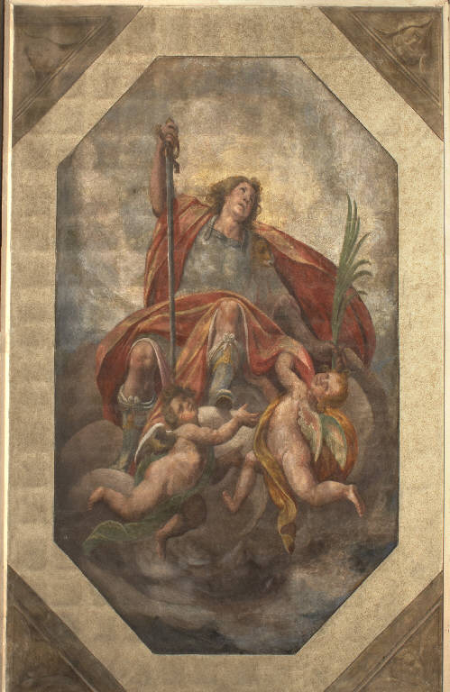 - NOTIZIE STORICO CRITICHE Il presente lacerto di affresco insieme ai successivi (catalogati alle schede u5020-00036-45) raffiguranti "San Gervaso portato in gloria da angeli", "Sant'Ambrogio portato in gloria da angeli", "Gloria di angeli e cherubini" (quattro frammenti), "Sant'Ambrogio", "Sant'Agostino", "San Gregorio Magno", "San Gerolamo", apparteneva ad un'unica decorazione pittorica estesa all'abside, vele e cupola della chiesa di San Protaso ad Monacos di Milano. Tutto il ciclo viene riferito al pittore Giovanni Mauro Della Rovere (1575-1640), come anche indicano le targhette metalliche apposte ai singoli telai. Demolita la chiesa nel 1930 per lasciare posto alla Banca di Novara, il ciclo di affreschi fu strappato, restaurato e montato su telai a cura dell'amministrazione comunale di Rho. Attualmente si trovano in deposito parte in palazzo Comunale, parte presso la chiesa di San Maurizio a Terrazzano (cfr. "Milano, le Chiese scomparse", a cura di M. Caciagli, J. Ceresoli, P. Di Marzo, Milano 1998, 3 voll., II, p. 16, tavv. 18-24). Qui si dice "al primo Seicento risalgono le decorazioni della volta eseguite da Mauro Della Rovere d'Emes detto il Fiammenghino 1575 ca-1640: la Vergine col Bambino, e S. Ambrogio col pastorale in pugno ed il flagello ...qui ritratto mentre si alzava in gloria sorretto da angioletti carnosi nel riquadro centrale; invece negli altri due riquadri della volta sempre gli angeli portavano in gloria i due santi Protaso e Gervaso. L'abside sulle quattro vele era ornata entro immense incorniciature a stucco da glorie di Angeli".\nZani V. (1999, pp. 209-210), non cita nella produzione del Fiammenghino gli affreschi ad oggetto.