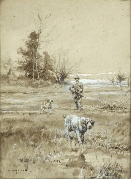 - NOTIZIE STORICO CRITICHE L'opera riproduce una semplice scena di genere di ambito venatorio, tipico soggetto prediletto dall'autore che si specializzò fin da giovane nello studio anatomico degli animali e lavorò anche come illustratore di giornali sportivi; l'opera si inserisce nel periodo maturo dell'autore.