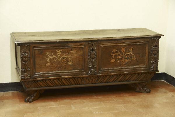 Cassapanca a forma di parallelepipedo caratterizzata da un doppio motivo a intarsio sul fronte anteriore raffigurante un vaso con fiori; tale motivo decorativo è accompagnato da tre formelle a forma di lesena raffiguranti teste di angioletti contornate da motivi vegetali.
