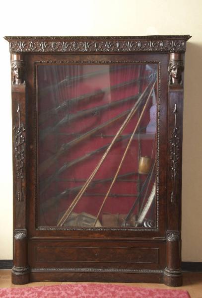 Grande mobile-vetrina portafucili adornato alla sommità da fregio a palmette alternate, sui lati a destra e sinistra da teste di cariatidi e motivo decorativo a freccia e nastro intrecciato.