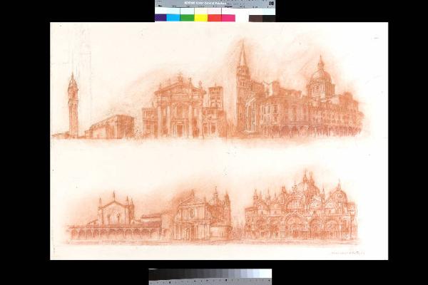 - NOTIZIE STORICO CRITICHE Disegno preparatorio per la pala, collocata in un altare laterale del Duomo di Mantova dedicato a Papa S. Pio X, Vescovo Giuseppe Sarto in Mantova. La tela ripercorre idealmente le tappe del ministero di Sarto, come vescovo, patriarca e Papa. "L'opera che sembra segnare la maturità piena dell'artista, non toccato certo dal peso degli anni, arricchita anzi da completa esperienza di vita e di spirito, è senz'altro la grande pala dell'altare di S. Pio X nella navata sinistra del Duomo di Mantova che ebbe l'avventura di essere, per così dire, inaugurata da Papa Giovanni Paolo II nella visita apostoliva a Mantova nel 1991. [Ferrari C., in "Dal Prato. Opere 1922-1999", a cura di Dalcore P., Mantova 1999, pp. 23-24]. Sullo sfondo della pala d'altare si riconosce "un panorama di sacri edifici che riassume il progredire della vita sacerdotale di Giuseppe Sarto prima della sua assunzione al soglio pontificio" [ Zanotti P. "La sua impronta, ieri, oggi...domani", in "Alessandro Dal Prato. 1909-2009 Celebrazioni nel centenario della nascita", Guidizzolo 2009, p. 46].