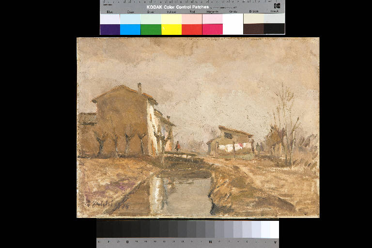 - NOTIZIE STORICO CRITICHE Paride Falchi ha nutrito la sua vita artistica "della quotidiana pratica della pittura e nient'altro, senza partecipare a movimenti, senza firmare manifesti e, fino ad un certo punto, persino senza esporre (...) la sua presenza è una "non presenza" decisa e irriducibile, la sua tesi pittorica è un'antitesi. E fin qui tutto sarebbe relativamente semplice, dopo avergli riconosciuto un posto tra i maggiori pittori "di genere" mantovani, ma a complicare il discorso c'è l'infinita dolcezza - specificatamente virgiliana - della sua vena poetica e la costante qualità (...). Mentre dipinge, la comunione con quanto lo circonda è totale. Ha lavorato anche su altri paesaggi, ad esempio su quello ligure, ma la quasi totalità della sua produzione riguarda il cuore della Padania attorno a Sabbioneta. Rare, anche se fruttifere, le incursioni nella città: Mantova gli ha sempre reso ottime vedute, a riprova della sua potenzialità espressiva. (...) Predilige l'inverno quando la natura diviene misteriosa, la luce è più diffusa e le variazioni di colore sono meno percettibili, e impera, nella campagna addormentata, il silenzio. (...) E nella sua pittura questo silenzio è tradotto in immagine, se ne percepisce il senso, diviene valore ottico. E questo sentimento che ritroviamo anche nell'opera di altri artisti mantovani, come elemento tipicizzante. Si possono rammentare a questo proposito, tra gli altri, pittori come il primo Giordano Di Capi, Gino Donati, Giuseppe De Luigi, i quali, pur esprimendosi con modi del tutto differenti, possiedono questa caratteristica. Anche quando il pittore sabbionetano pone figure a movimentare le sue traduzioni dell'ambiente cittadino, persiste quest'atmosfera che egli predilige e che trasferisce nei dipinti, si direbbe, inconsciamente" [Margonari R., 1983 in "Artisti a Mantova nei secoli XIX e XX. Dizionario biografico", a cura di Sartori A. e Sartori A., Mantova 1999-2004, pp. 1134-1142].\nSul verso del dipinto è disegnata a matita la maschera sorridente di un uomo con baffi.