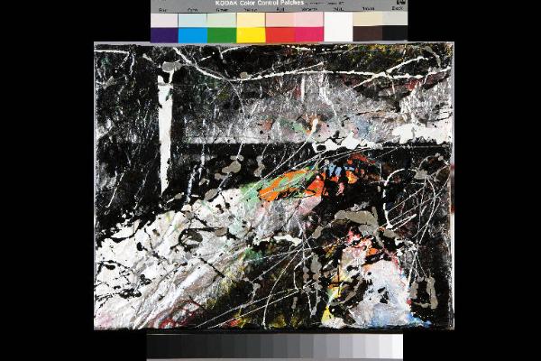 Dipinto a tecnica mista: olio, smalti, resine colorate su tela contorta e distesa