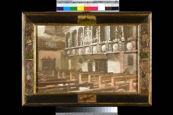 - NOTIZIE STORICO CRITICHE La cornice intagliata e dipinta dall'artista, è testo iconografico che completa la narrazione del dipinto. All'interno della cornice, vi è l'interno silente del Santuario delle Grazie, all'esteno, sulla cornice, in alto Haupala ritrae una veduta dello stesso Santuario dal Lago Superiore di Mantova. In basso il coccodrillo: animale impagiato che pende sulla testa dei fedeli dalla volta d'ingresso all'edificio di culto. Ai lati, la cornice, come lo zoom di un obiettivo fotografico, ingrandisce alcuni dettagli del dipinto: sono raffigurate quattro delle statue devozionali, che si affacciano dall'alto dell'impalcatura lignea lungo i lati lunghi della navata.