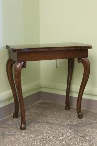 Tavolino da gioco in legno di noce sorretto da quattro gambe con doppia curva a "S" terminanti con piedi caprini. I sostegni, che si ingrossano nella parte superiore, si collegano con una voluta ad una fascia dai profili netti. Il piano dalla linea sagomata può essere aperto.