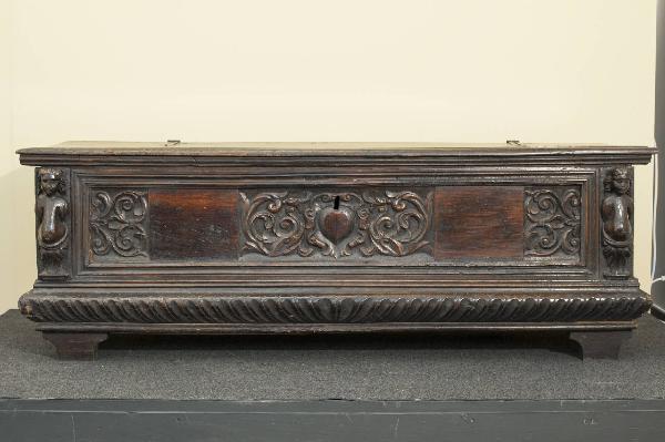 Cassone di forma squadrata in legno di noce poggiante su piedini a "mensola rovesciata". Base composta da cornice con motivo baccellato. Nel centro del prospetto uno scudo per stemma è contornato da girali vegetali che si intrecciano simmetricamente; alle estremità due riquadri con il medesimo motivo ornamentale. Gli spigoli laterali sono sottolineati da due cariatidi aggettanti. Coperchio apribile.