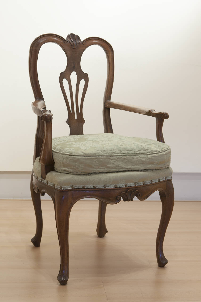 - NOTIZIE STORICO CRITICHE Fra la grande varietà di sedie e poltrone prodotte nel territorio lombardo-veneto nel Settecento, questo modello fu tra i più fortunati, riproposto in diverse versioni con minine varianti anche nelle regioni limitrofe, in particolare in Emilia. Il modello emiliano si distingue dal prototipo lombardo-veneto, più elegante, per piccole differenze nell'intaglio e nella leggerezza dell'insieme e per forme più marcate e massicce. La poltrona in esame, stilisticamente vicina ad una sedie di cinque sedie conservate presso la Galleria dell'Accademia Tadini (nn. inv. Mobili M241-245), fa parte del legato Francesco Zitti del 1953. Il sedile imbottito è rivestito con un tessuto moderno non pertinente.
