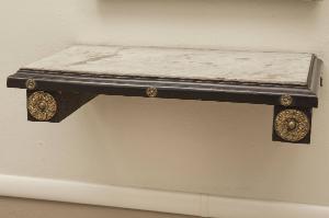 Coppia di mensole composte da piano rettangolare in marmo bianco inserito in struttura lignea verniciata; fascia ornata da borchie metalliche applicate.