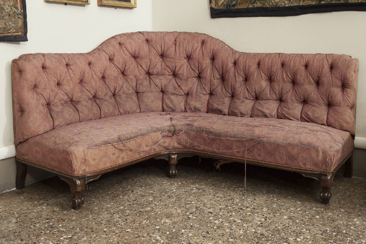 - NOTIZIE STORICO CRITICHE La presenza di elementi ripresi dal repertorio settecentesco, come le gambe anteriori terminanti a ricciolo di chiara derivazione rococò, uniti alle novità dei tempi nuovi, come le gambe posteriori leggermente "a sciabola" tipiche dell'Impero e l'esigenza di privilegiare comodità e funzionalità, consentono di riferire gli arredi in esame ad una produzione di pieno Ottocento. La stilizzazione e la serialità dell'intaglio confermano una datazione nella seconda metà del secolo. L'imbottitura di sedile e schienale è rivestita da filaticcio rosso operato coevo. Nella Galleria dell'Accademia sono presenti due divani stilisticamente simili (nn. inv. Mobili M72-M73).