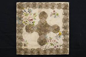 Borsa del corporale in taffetas liserè broccato. Su di un fondo bianco si sviluppa un motivo ornamentale a bouquets floreali. Galloni in oro filato e oro laminato lavorati a fuselli.