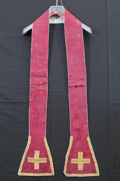 - NOTIZIE STORICO CRITICHE La stola è realizzata in damasco, un tessuto operato caratterizzato da effetti di disegno opachi prodotti da una sola armatura (il raso). Sono prescritti paramenti di colore rosso nella Domenica delle Palme, nella solennità della Pentecoste, nel Venerdì Santo, nella festa dell'esaltazione delle Croce, nelle feste degli Apostoli e nelle commemorazioni dei martiti.\nQuella in esame presenta un disegno ispirato allo "stile Impero" di ascendenza francese molto in voga anche tra i tessuti nel XIX secolo. Questa moda, diffusa anche in Italia, vedeva la presenza di molti elementi decorativi desunti dal repertorio classico come le infiorescenze acantiformi.