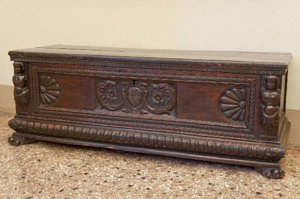 - NOTIZIE STORICO CRITICHE In questo cassone, riferibile ad un'area lombarda di primo Seicento, la tonalità scura e compatta del legno in noce valorizza il contrasto tra le superfici piane e gli intagli a forte rilievo. La matrice settentrionale, lombarda in particolare, è suggerita dalla forma squadrata, dalle proporzioni perfette e dai motivi ornamentali ancora legati al Rinascimento (zampe leonine, dentelli, baccellature, palmette e girali acantiformi). Per parecchi decenni nel corso del XVII secolo, il cassone continuò infatti ad essere usato senza sostanziali modifiche rispetto al secolo precedente. Oltre ai piedi leonini venivano talvolta usati sostegni squadrati "a cartella". La fronte, sempre meno intarsiata, era spesso ripartita in campiture decorate a rilievi geometrici con uno stemma gentilizio scolpito al centro (nel caso in esame quello della famiglia Marenzi). Gli spigoli laterali continuarono ad essere ornati da figure o elementi vegetali in rilievo.