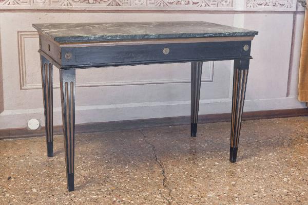 Tavolino in legno di noce verniciato; sostegni scanalati di forma tronco-piramidale; fascia decorata con borchie in metallo dorato; piano rettangolare in marmo verde macchiato.