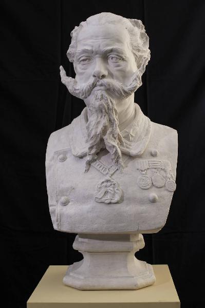 - NOTIZIE STORICO CRITICHE Si tratta del modello in gesso del busto in marmo bianco di Carrara che lo scultore loverese Daniele Capitanio, anch'egli attivo nelle campagne garibaldine, realizzò nel 1881 per Piazza degli Uffici. Tra il 1881 ed il 1887 Lovere innalzò nelle piazze pubbliche diverse sculture celebrative dell'epopea risorgimentale. .\nPresso l'Accademia Tadini sono presenti altri busti in gesso raffiguranti personaggi del Risorgimento italiano (cfr. nn. Museo del Risorgimento del 2011 2011 MRS10 "Busto di Giuseppe Garibaldi; MRS12 "Busto di Giuseppe Mazzini"; MRS13 "Busto di Camillo Benso conte di Cavour"; MRS14 "Busto del re Umberto I"; MRS017 "Busto di Vittore Tasca" e MRS18 "Busto di Giovanni Battista Camozzi").\nLa scultura fa parte della collezione di Giovanni Battista Zitti raccolta nelle sale della villa "Caprera" a Bossico donata all'Accademia Tadini dalla cognata Teresa Banzolini Storti nel 1915.