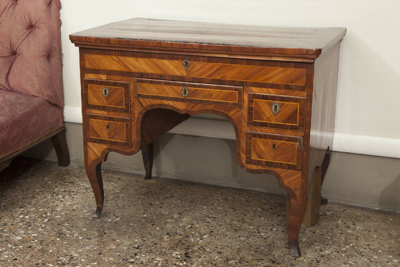 - NOTIZIE STORICO CRITICHE Si tratta di una tipologia di mobile nata nel periodo "Luigi XV", quando la produzione di arredi adibiti ad usi particolari era di gran moda, e ampiamente diffusa anche in Italia, soprattutto nelle zone più attente alla moda corrente. Se le proporzioni misurate ed armoniose e le gambe arcuate "en cabriole" della toilette in esame sono pienamente in linea con lo "stile Luigi XV", la linea mossa del fronte nonchè i sostegni eleganti e sottili si rifanno ai modi di una produzione tarda riferibile a quegli ebanisti, attivi nell'ultimo quarto del Settecento nell'Italia settentrionale, che risentirono in modo evidente dell'influenza francese.