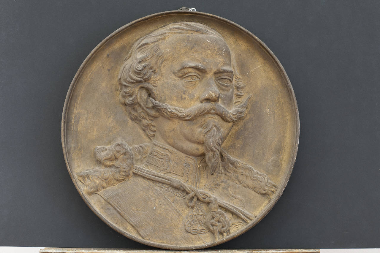 Coppia di rilievi in bronzo fuso di forma circolare con bordo esterno rialzato. Al centro è raffigurato il volto del re Vittorio Emanuele II.