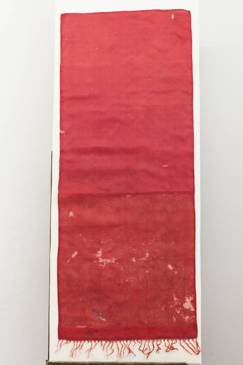 Sciarpa in voile di seta rosso con terminazioni sfrangiate.