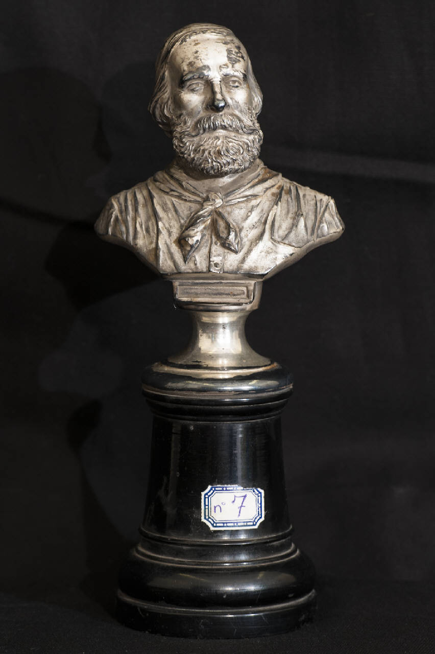 - NOTIZIE STORICO CRITICHE Si ipotizza che il manufatto in esame, di piccole dimensioni, sia riferibile ad una produzione locale dell'ultimo quarto dell'Ottocento. Il busto, che raffigura Giuseppe Garibaldi con il consueto foulard annodato intorno al collo, è realizzato in metallo fuso, quindi in un materiale durevole nel tempo. Il lavoro è stato poi ultimato argentando la superficie.\nL'opera, che risulta presente in Accademia Tadini già dal 1915 come conferma l'inventario redatto in quell'anno, fa parte della collezione di Giovanni Battista Zitti raccolta nelle sale della villa "Caprera" a Bossico donata all'istituzione dalla cognata Teresa Banzolini Storti proprio nel 1915.