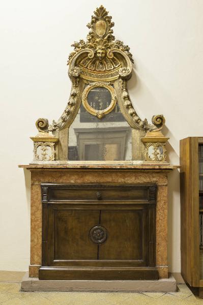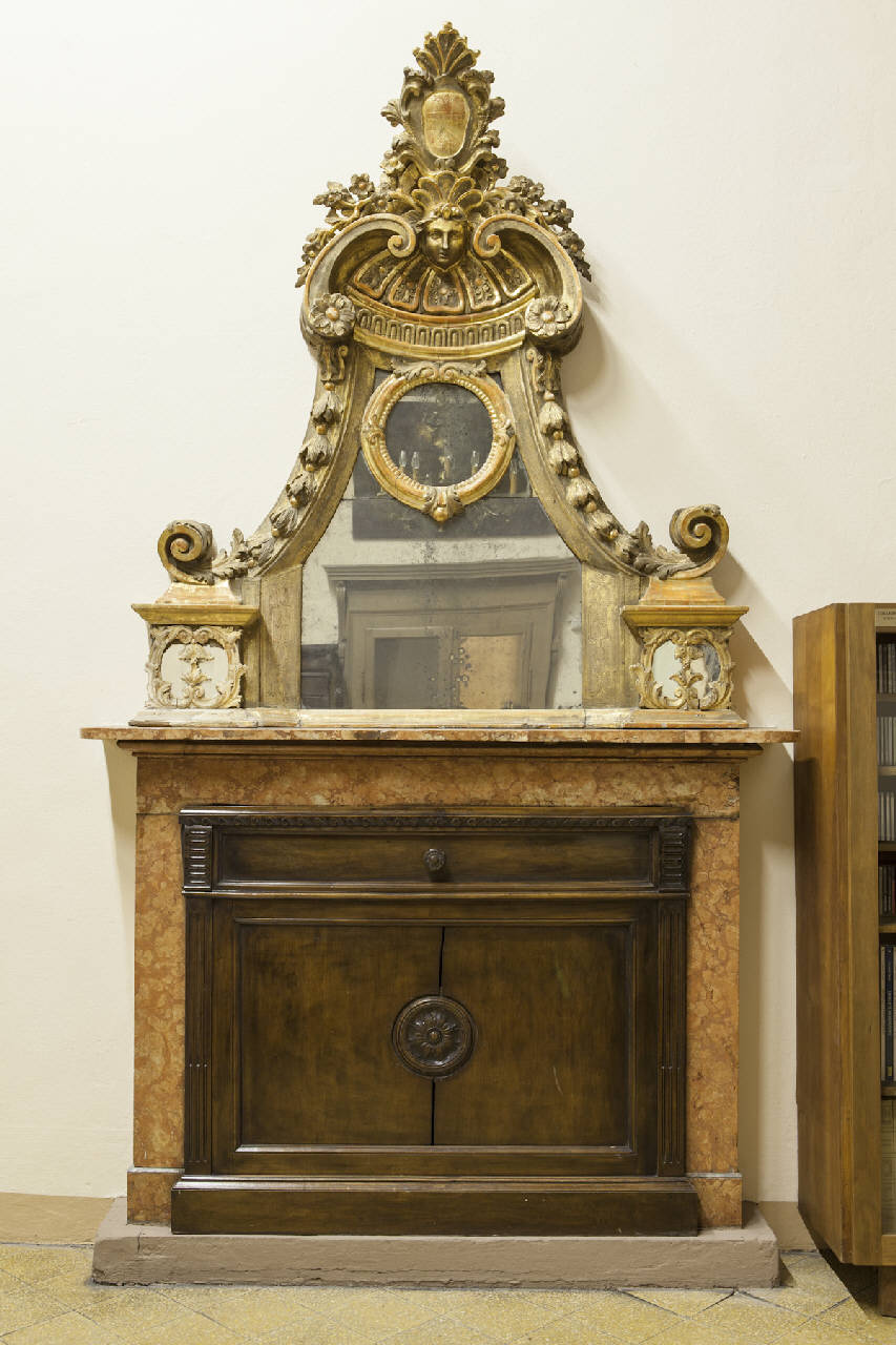 - NOTIZIE STORICO CRITICHE Si tratta di uno specchio posto sopra il camino a scopo ornamentale che fa parte del legato del conte Tadini del 1828. L'introduzione di motivi ripresi dal repertorio antico come racemi vegetali, fiori, festoni e volute esprimono quel rinnovamento classicista che, verso la fine del Settecento, andava sfoltendo i decori barocchetti, razionalizzandoli in una impaginazione più rigorosa e assolutamente simmetrica rispetto ad un asse centrale. Per quanto riccamente combinati tali elementi non annullano il sostanziale carattere architettonico del manufatto.