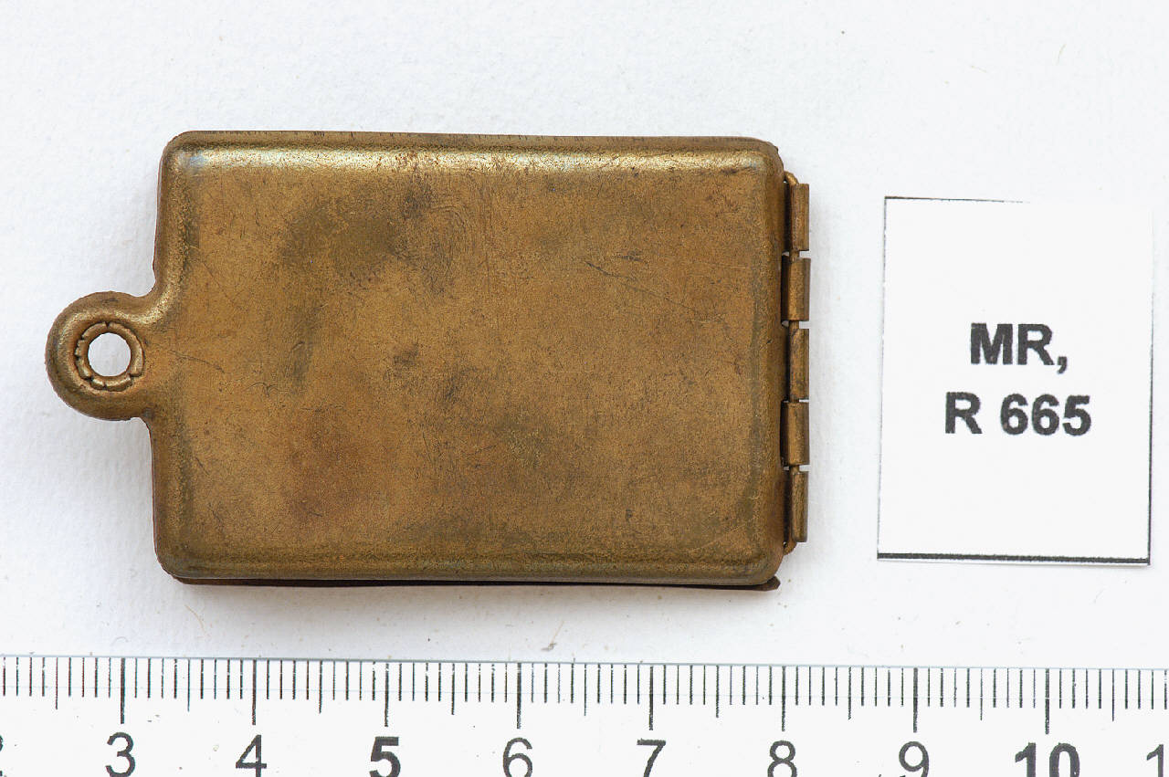 • NOTIZIE STORICO CRITICHE Si tratta della teca entro cui, per parte della Prima Guerra Mondiale, venivano conservati i documenti identificativi dei militari. L'oggetto è incluso nella collezione di medaglie donata da Fortunato Canevali all'Accademia Tadini nel 1916, ma non si tratta né di un bene numismatico, né paranumismatico.