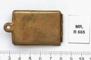 Piccolo contenitore rettangolare schiacciato a due valve incernierate con appiccagnolo circolare.