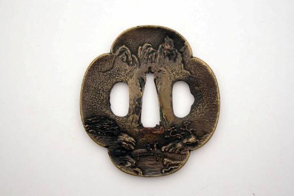 Elsa di spada giapponese di forma quadrilobata (mokkogata), con i tre fori canonici, quello centrale (nakagoana) per il codolo, il foro di sinistra (kozuka hitsuana) per il coltellino, e quello di destra (kogai hitsuana) per lo spillone. E' rappresentato un paesaggio di montagna, dove due samurai stanno attraversando un ponte di legno per andare verso una casa. Il paesaggio è dominato dalla presenza di alte montagne rocciose. L'oggetto è stato realizzato in Sentoku, una lega simile all'ottone.
