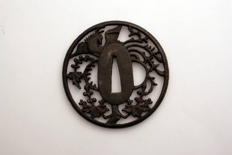 - NOTIZIE STORICO CRITICHE In Giappone l'elsa è detta "tsuba". La sua funzione primaria è quella di fare in modo che la mano di chi impugna la spada non finisca sulla propria lama, oltre a bilanciare la spada e a proteggere la mano dalla lama dell'avversario.\nIndirettamente, gli tsuba servivano anche a mostrare lo stato sociale e il gusto personale e, come per altri oggetti d'uso, divennero presto un mezzo d'espressione artistica.\nDal XIX secolo, quando la spada e i suoi accessori divennero più decorativi che funzionali, e ancor più dal 1878, a seguito della proibizione di portare la spada, gli tsuba erano prodotti come oggetti da collezione favoriti dagli occidentali, che li vedevano come una originale e nuova forma d'arte. Molti di questi oggetti raggiunsero infatti l'Europa già nell'Ottocento.\n\nI fori laterali, hitsuana servivano a lasciare passare i manici dei piccoli oggetti decorativi e d'uso che sporgevano dal fodero.\n\nL'uccello "hoo" è convenzionalmente definito "fenice". SI tratta di una definizione di comodo, contestata però da alcuni autori. Le piume di questo uccello, sono dipinte in cinque colori diversi che rappresentano le cinque virtù traducibili grossolanamente in umanità, decenza, saggezza, fedeltà e amore. Quando è rappresentato insieme al ramo di Kiri, simboleggia l'autorità imperiale giapponese.